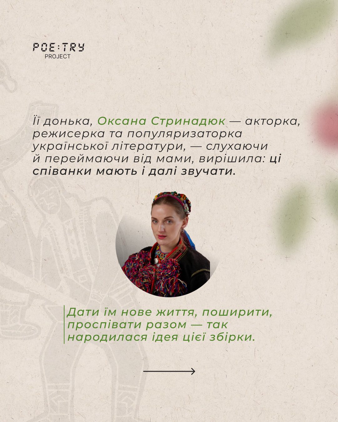 Її донька, Оксана Стринадюк — акторка, режисерка та популяризаторка української літератури, — слухаючи й переймаючи від мами, вирішила: ці співанки мають і далі звучати. Дати їм нове життя, поширити, проспівати разом — так народилася ідея цієї збірки.