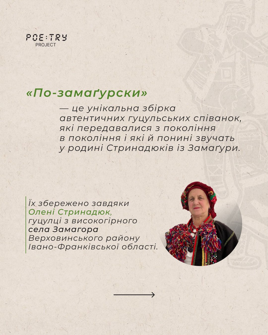 «По-замаґурски» — це унікальна збірка автентичних гуцульських співанок, які передавалися з покоління в покоління і які й понині звучать у родині Стринадюків із Замаґури.